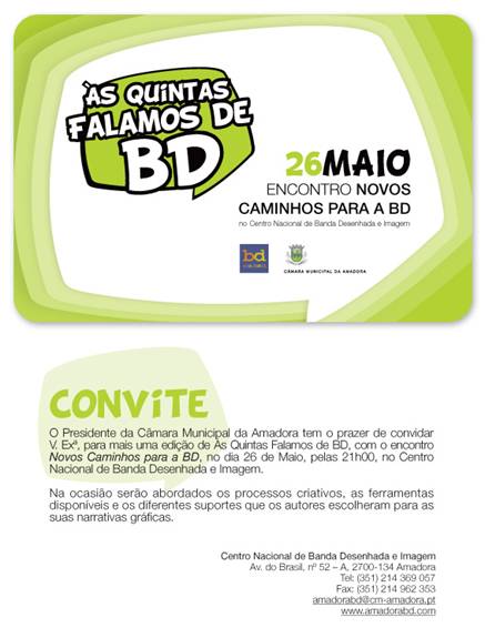 Realiza-se amanhã, dia 26 de Maio pelas 21.00 horas no Centro Nacional de Banda Desenhada e Imagem, na Avenida do Brasil, nº 52, na Amadora, mais uma tertúlia onde se fala de banda desenhada, a exemplo, aliás, do que tem acontecido nas últimas quintas feiras dos últimos meses, em que estive presente. Nesta, porém, juntamente com Luís Guerreiro, azulejista artísitico, os autores José Ruy e José Pires e os divulgadores de BD Nuno Amado (Bongop) e Nuno Neves (Verbal), irei ser um dos oradores e falarei um pouco sobre o meu processo criativo, utilizando o computador como ferramenta de suporte. Por isso, deixo aqui o convite a todos quantos queiram aparecer e conhecer um pouco mais sobre alguns dos novos caminhos para a BD...
