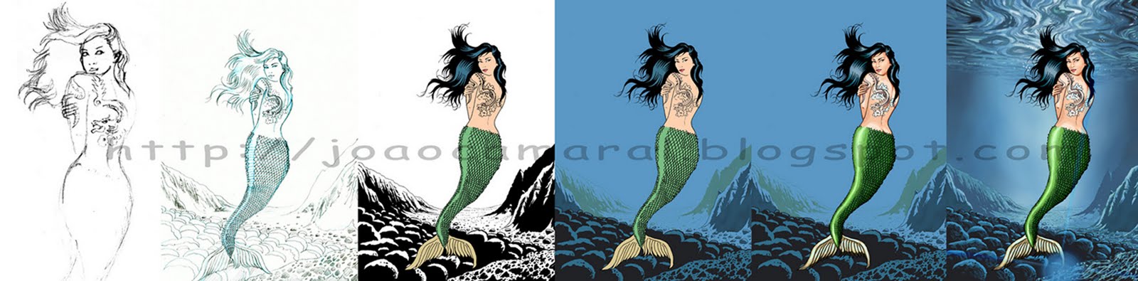 A começar o ano, deixo hoje aqui uma imagem com uma sereia, que elaborei para a newsletter do The Way of The Exploding Pencil. Em baixo mostro alguns dos estágios de produção, desde o esboço inicial que representa a primeira ideia que tinha para o desenho, até à arte final...