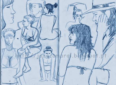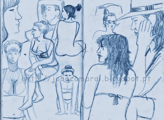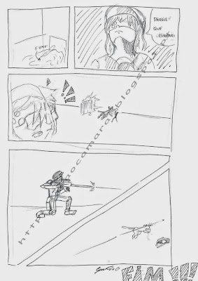 Para já, deixem-me dizer que, embora estas sessões tenham uma espécie de guião definido, há sempre oportunidade de desenvolver coisas que tornam cada visita única. Este ano, a exemplo do que sucedeu o ano passado em Espinho, houve a oportunidade durante a minha visita à Escola José Gomes Ferreira, em Lisboa, de efectuar uma espécie de comic jam com alguns dos alunos presentes. Eu fiz na hora o primeiro quadradinho e o objectivo era que cada um dos alunos fizesse outro e, tinha a certeza absoluta, de que a coisa iria dar um resultado completamente diferente daquilo que eu próprio imaginava.